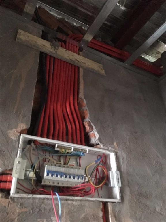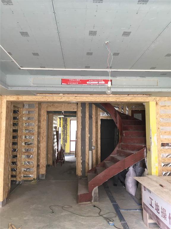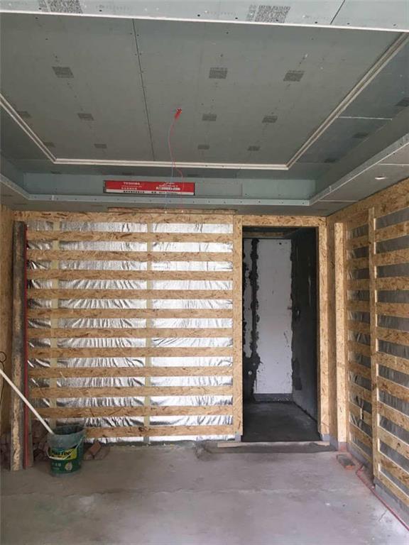 墻面木基層均勻,加貼防潮膜。因全屋要做地熱,地面已經敲過保溫層,地面的電線布管只好直接鋪設。